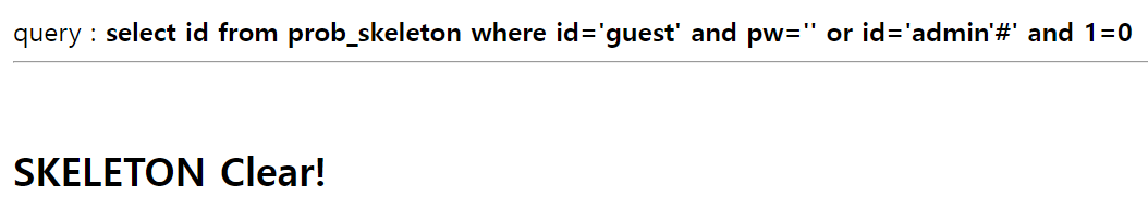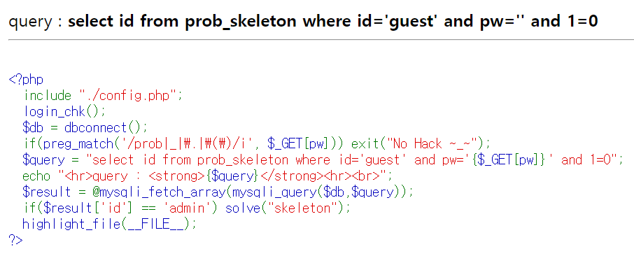 $query = "select id from prob_skeleton where id='guest' and pw='{$_GET[pw]}' and 1=0";