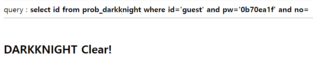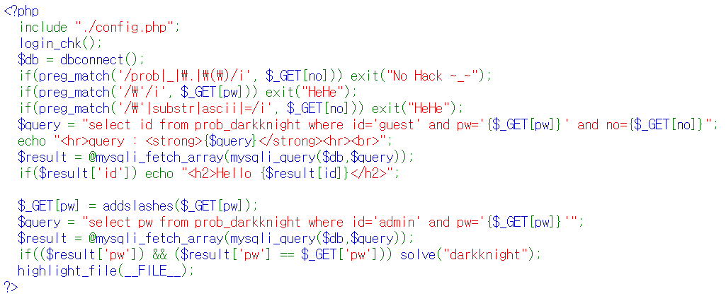 $query = "select id from prob_darkknight where id='guest' and pw='{$_GET[pw]}' and no={$_GET[no]}";