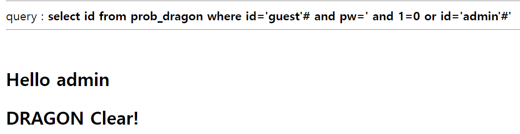 $query = "select id from prob_dragon where id='guest'# and pw='{$_GET[pw]}'";