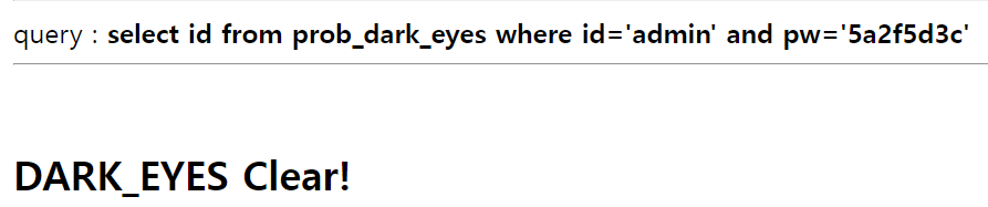 if(($result['pw']) && ($result['pw'] == $_GET['pw'])) solve("dark_eyes");
