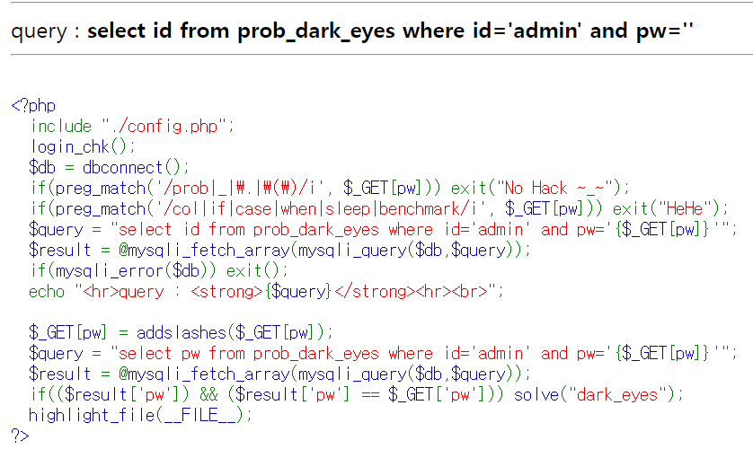 $query = "select pw from prob_dark_eyes where id='admin' and pw='{$_GET[pw]}'";
