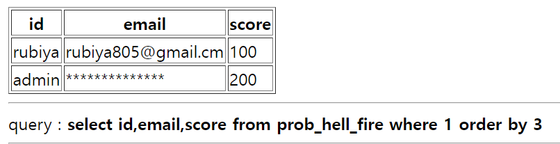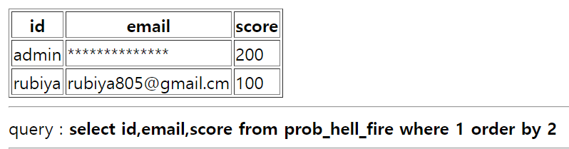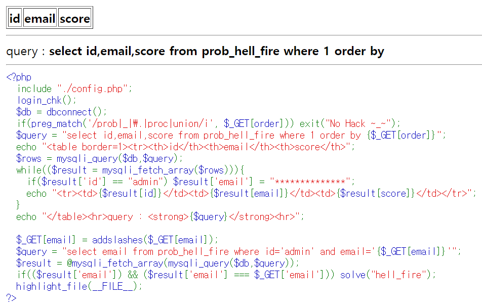 $query = "select id,email,score from prob_hell_fire where 1 order by {$_GET[order]}";