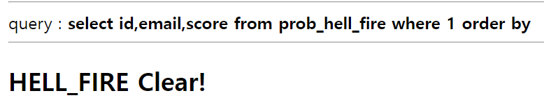 if(($result['email']) && ($result['email'] === $_GET['email'])) solve("hell_fire");