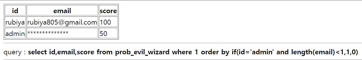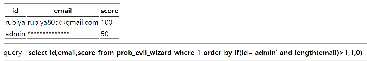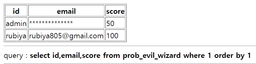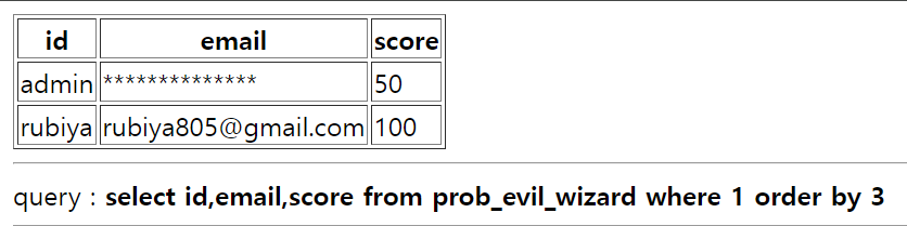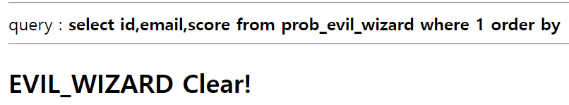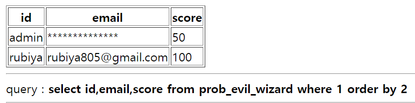 $query = "select id,email,score from prob_evil_wizard where 1 order by {$_GET[order]}"; // same with hell_fire? really?
