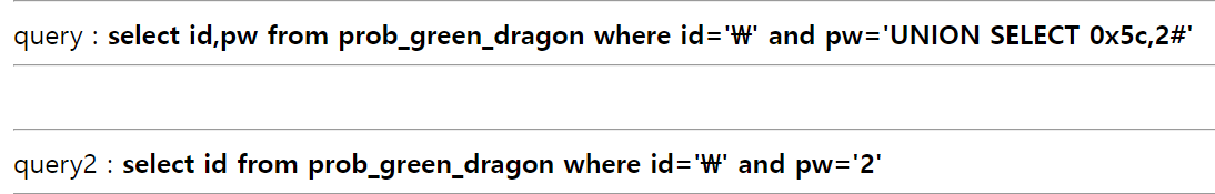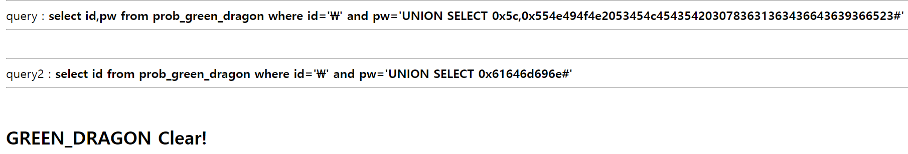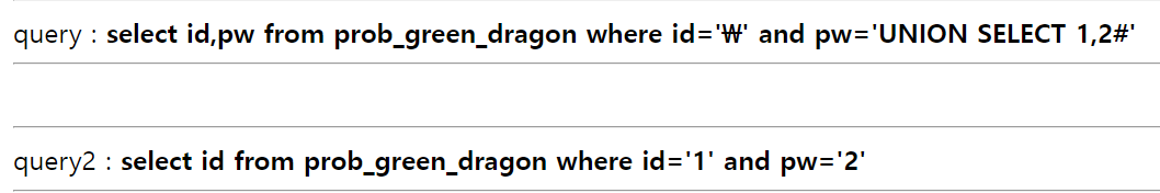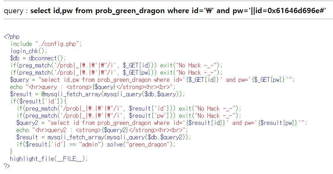 $query = "select id,pw from prob_green_dragon where id='{$_GET[id]}' and pw='{$_GET[pw]}'";