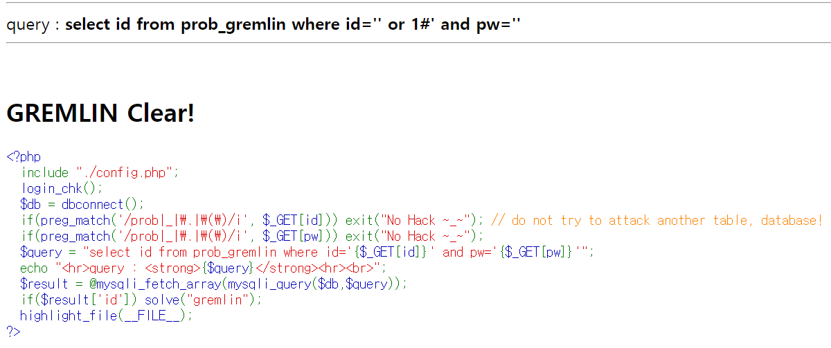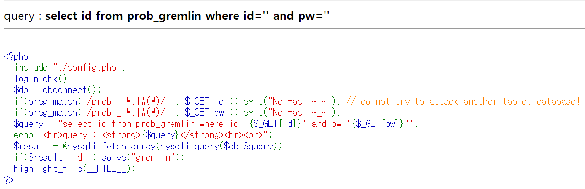 $query = "select id from prob_gremlin where id='{$_GET[id]}' and pw='{$_GET[pw]}'";