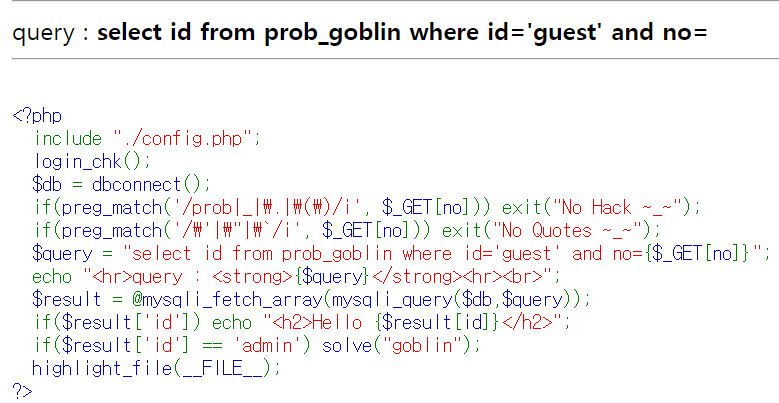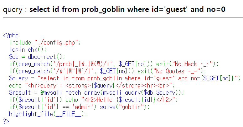 $query = "select id from prob_goblin where id='guest' and no={$_GET[no]}";