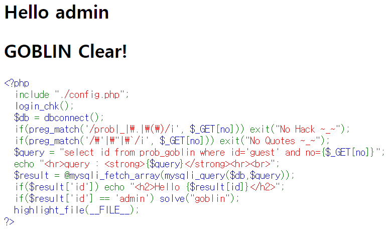 prob_goblin 테이블에서 id='guest' and no={$_GET[no]}인 행이 존재할 경우